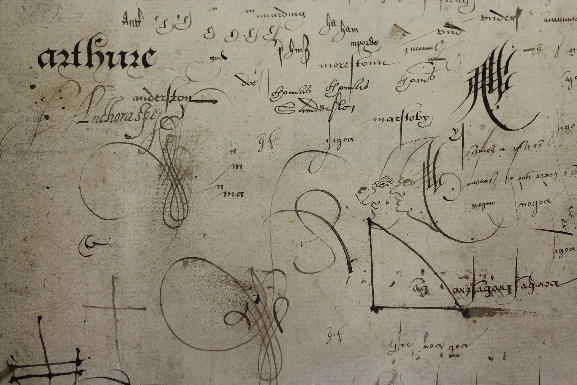 Inscriptions of ‘Thomas Sanderston’, ‘Anderstoun’, John Tirbecke’ (?).